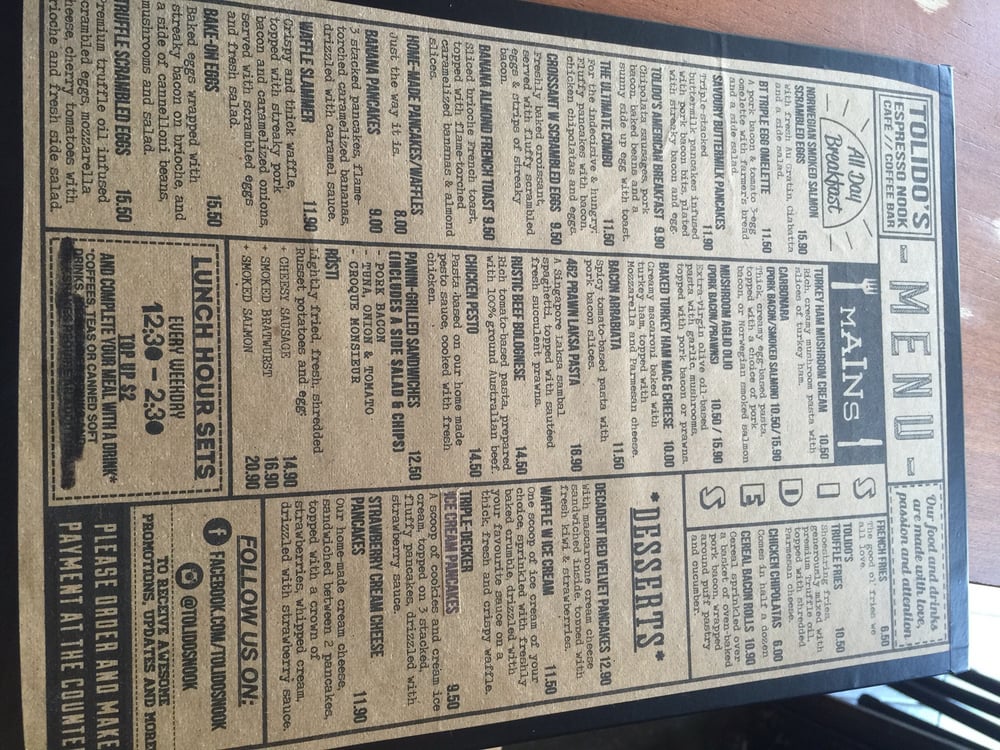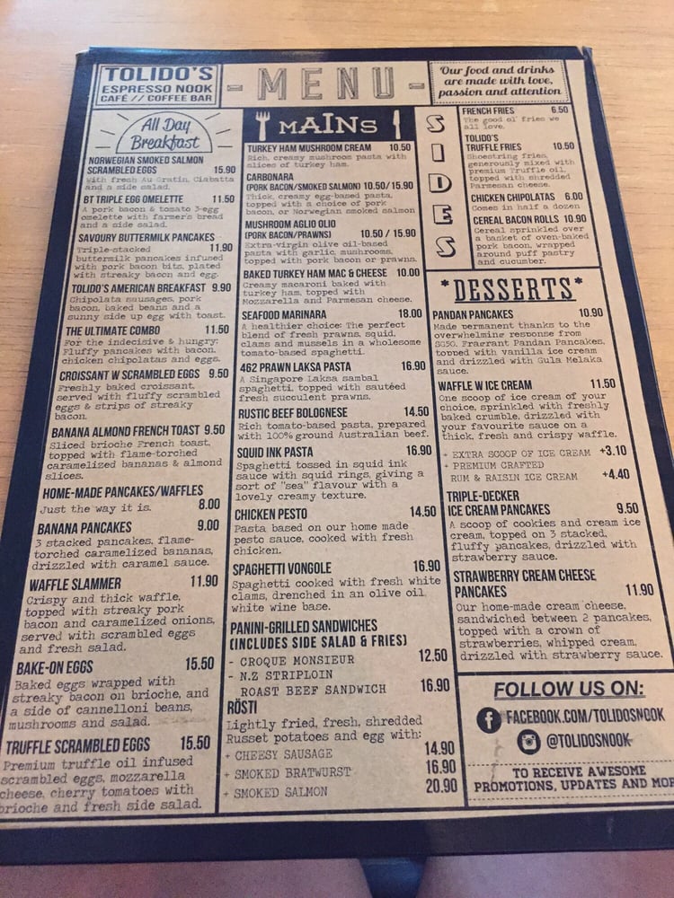 Welcome to Tolido’s Espresso Nook, a delightful eatery nestled in the heart of Singapore. This cozy spot specializes in breakfast and brunch, serving meals all day long that are not only visually striking but also bursting with flavor.